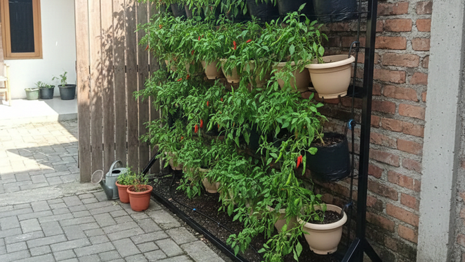 Dalam perawatannya, rak vertikal bertingkat memudahkan proses penyiraman, pemupukan, dan panen karena posisi tanaman sejajar dengan pandangan mata. Model ini sangat cocok diterapkan di teras rumah atau halaman sempit yang tetap mendapatkan sinar matahari langsung.